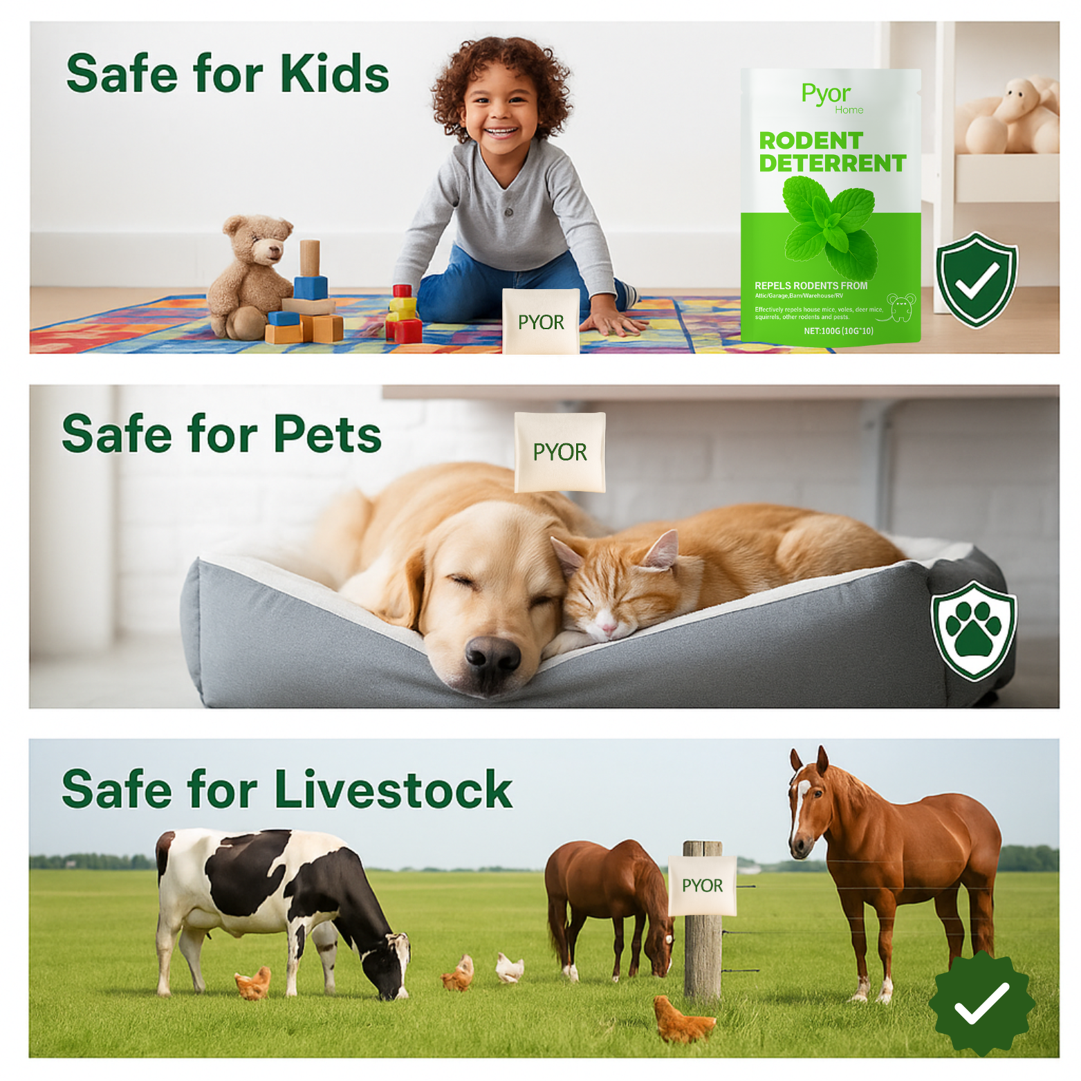 Pyor Pouches™ are made with 100% plant-based essential oils. It's tough on mice, gentle on your family.